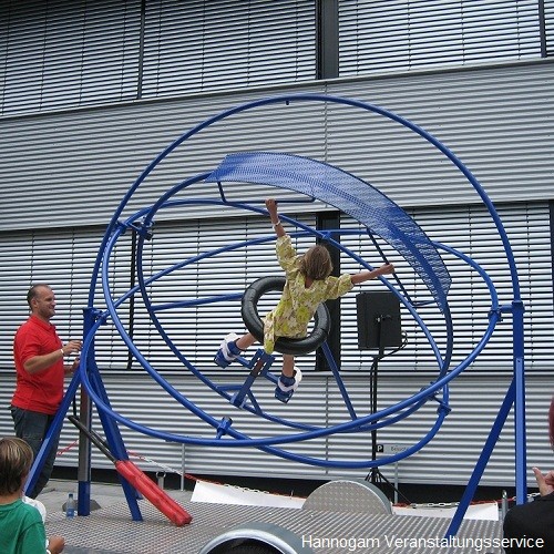 Der Aerotrim trainiert die Körperspannung der Astronauten. Allein durch Gewichtsverlagerung kann man die drei Achsen des Aero Space zum rotieren bringen und schnelle Bewegungen in alle Richtungen vollführen. Die geschulten Teamer des Hannogam Eventservice achten dabei auf die richtige Sicherung der Mitspieler/innen und helfen den Teilnehmern im entscheidenden Moment den Kopf wieder nach oben zu bekommen. Ein hoher Spaßfaktor ist beim Astronautentrainer immer garantiert! Ermöglichen Sie den Teilnehmern Ihrer Veranstaltung dieses unbeschreibliche Gefühl kennenzulernen. Das Aktionsgerät das selbst Astronauten zum Training nutzen. Der Aerotrim wird deutschlandweit ab den Vermietstationen des Hannogam Veranstaltungsservice in Hannover, Hamburg, Göttingen, Magdeburg, Bremen und Bielefeld vermietet. Leihen sie den Astronautentrainer für Ihre Firmenfeier in Hannoversch Münden, Northeim, Wolfsburg, Salzgitter, Bad Oeynhausen oder Minden. Der Verleih vom Aerotrim zu ihrem Straßenfest, Stadtfest, Verkaufsoffenem Sonntag oder Sportfest kann aber auch zum Beispiel nach Walsrode, Hildesheim, Helmstedt, Oldenburg, Norderstedt oder Schwerin erfolgen. Der Hannogam Eventservice ist eine bundesweite Vermietung von Eventmodulen.