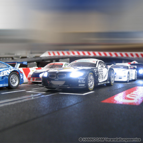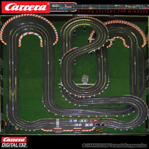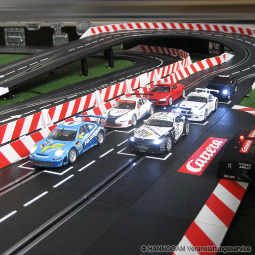 Mit dieser Carrera Bahn können Sie sowohl kleine wie auch große Gäste begeistern. Die Länge der beiden Spuren beträgt 18m, sodaß gleichberechtigte Rennen mit der gleichen Streckenlänge je Spur ausgetragen werden können. Die Carrerabahn kann mit bis zu 6 Autos gleichzeitig befahren werden, die an mehreren Stellen die Fahrspur wechseln können um die Ideallinie zu fahren oder um rasante Überholmanöver auszuführen. Die Auto Rennbahn verfügt über eine Rundenzählung mit Anzeige der führenden Fahrzeuge. Außerdem sind die Carrera Autos mit Frontscheinwerfern und Rückleuchten ausgestattet. Um einen realistischen Rennverlauf zu simulieren kann der Spritverbrauch beim Rennen berücksichtigt werden. Die Fahrzeuge müssen dabei die Pit Stop Lane ansteuern wenn der Tankinhalt zur Neige geht und den Tank auffüllen um anschließend in der gewohnten Geschwindigkeit das Rennen fortzusetzen. Sie können diese Carrera-Bahn beim Hannogam Eventservice für ihre Veranstaltung mieten. Der Hannogam Veranstaltungsservice ist eine Vermietung für Carrera-Rennbahnen in Hannover, Bremen, Hamburg, Göttingen, Magdeburg und Bielefeld. Die Autorennbahn ist bestens für ihre Firmenfeier, Weihnachtsfeier, Neueröffnung, Event, Jubiläum oder ein Stadtfest geeignet und begeistert alle Altersgruppen. Leihen sie sich diese Carrera-Bahn für ihr Event in Buchholz, Hameln, Lübeck, Gardelegen, Uelzen, Osnabrück oder Büren. Unser Autorennbahn Verleih führt bundesweit Veranstaltungen durch und kommt auch zu ihrem Event zum Beispiel in Itzehoe, Plön, Heide, Neustadt, Rendsburg oder Herford.