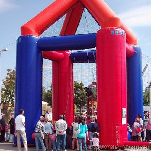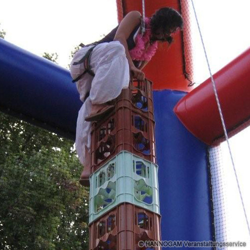Das Kistenstapeln ist durch seine Höhe ein weithin sichtbarer Publikumsmagnet und kann sowohl als Wettkampfmodul wie auch als Eventattraktion gemietet werden. Die jugendlichen oder erwachsenen Kletterer können mit etwas Geschick bis zu 23 Getränkekisten stapeln und daran emporklettern. Die Teilnehmer werden durch unsere erfahrenen Animateure beim stapeln der Getränkekisten unterstützt und gesichert. Das Kistenklettern besteht aus einem aufblasbaren Gestell zwischen dem Netze gespannt sind um das umherfliegen der Kisten zu begrenzen. Das Kistenklettern sieht so einfach aus aber ist es das auch? Es ist für alle Teilnehmer aber auch für die Zuschauer ein spannender Moment wenn der Kistenstapel kippt und die Kletterer abgeseilt werden. Das Kistenstapeln können Sie ab unseren Vermietstationen in Hamburg, Bremen und Hannover mieten. Der Hannogam Eventservice ist eine bundesweite Vermietung von Großspielgeräten wie Bullriding, Human Table Soccer, Fußballdart, Kinderkarussell oder Hüpfburg. Wir verleihen unser Kistenklettern zu Veranstaltungen in Syke, Wolfsburg, Pinneberg oder Delmenhorst. Unsere Eventattraktionen können Sie aber auch zu Firmenfesten, Abistreich, Stadtfest oder Verkaufsoffer Sonntag in Peine, Celle, Hildesheim oder Bremerhaven mieten. Fordern Sie einfach ein unverbindliches Angebot an. Gerne kombinieren wir diese Attraktion mit anderen Eventmodulen wie Kletterwand, Hindernis Parcours, Motorradbahn oder Riesenrutsche.