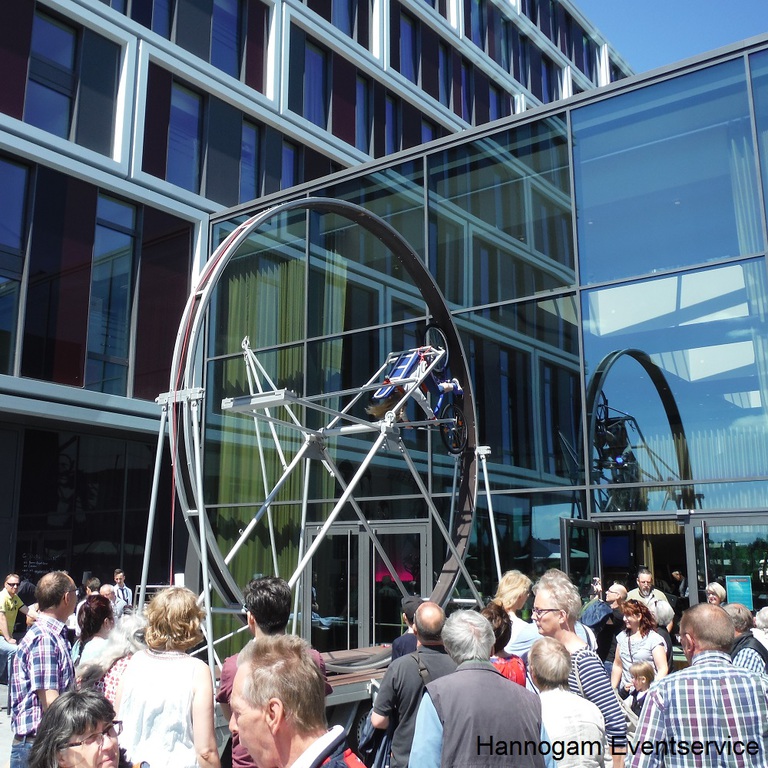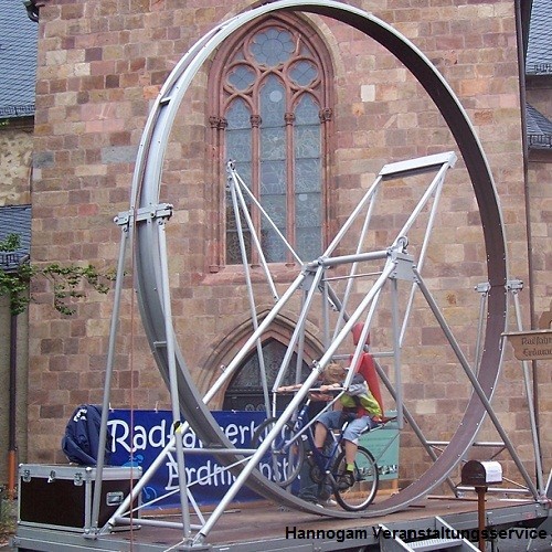 Das Loopingbike kann das Highlight Ihrer Veranstaltung sein. Egal ob Sie das Bikeloop zu Ihrem Stadtfest, Vereinsfest oder ihrer Firmenfeier mieten, diese Eventattraktion ist weithin sichtbar und somit ein idealer Publikumsmagnet. Unser Fahrradlooping kann ideal mit einer Hüpfburg zum Beispiel einem aufblasbaren Piratenschiff, der Rollenrutsche oder dem Kistenklettern kombiniert werden. Um Ihre Gäste mit leckerem Fun Food zu versorgen empfehlen wir Ihnen Zuckerwatte, Popcorn, Slush Eis oder Soft Eis. Das Überschlagfahrrad kann aber auch zusammen mit einem Skydancer sehr werbewirksam positioniert werden. Das 360 Grad Bike hat eine TÜV Prüfung und ein aktuelles Baubuch. Das Loopingbike können Sie ab unseren Standorten in Hamburg, Hannover und Bremen mieten. Wir führen aber auch bundesweite Veranstaltungen durch. Sollten Sie Ihre Feier in Oldenburg, Osnabrück, Dresden oder Berlin planen, sprechen Sie uns einfach an. Gerne erstellen wir Ihnen auch ein Angebot für Ihre Party mit unserem Bikeloop in Augsburg, Mannheim, Wiesbaden oder Köln. Bitte beachten Sie beim leihen des Loopingbike, das das Überschlagfahrrad fest auf einem PKW-Anhänger montiert ist und wir somit keine Stufen überwinden können.