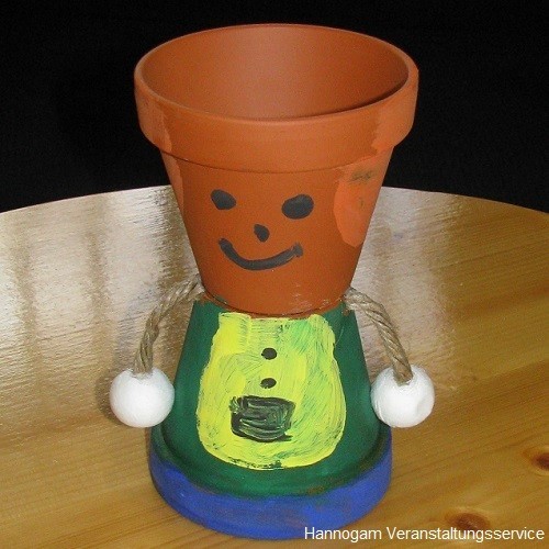 Eine unserer motivierten Animateurinnen bastelt mit Ihren kleinen Gästen Tontopffiguren. Wir bringen zu dieser Aktion 400 Tontöpfe und alle anderen benötigten Materialien mit. Diese Aktion eignet sich besonders gut für eine Indoorveranstaltung bei schlechtem Wetter und bindet die Kinder für eine lange Zeit.