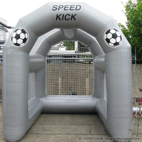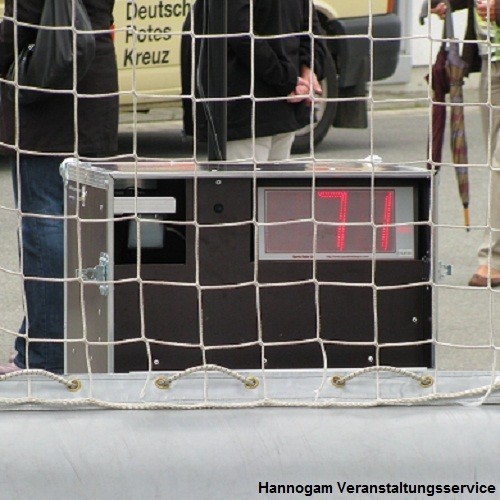 Die Radarmessanlage misst ihre Schuss Geschwindigkeit. Die Teilnehmer schießen mit einem Fußball auf das Netz im Tor, dabei misst die Radarpistole die Geschwindigkeit mit der der Ball das Netz trifft. Auf einem Display wird dann die Geschwindigkeit vom Ball je nach Einstellung in Kilometer pro Stunde oder in Miles per hour angezeigt. Dank der großen aufblasbaren Torwand Speedcheck oder Speedkick bleiben die Bälle im Spielfeld und müssen nicht zeitraubend aus dem Gebüsch oder einer Scheibe entfernt werden. Die Radarmessanlage Speedcheck verleihen wir ab unserer Radarmessanlagen Vermietung in Hannover, wir vermieten die Torschuss Geschwindigkeitsmessung ab unserem Verleih in Bremen und dem Standort vom Hannogam Eventservice in Hamburg. Der Hannogam Eventservice vermietet die Fußballmodule bundesweit also auch in Kassel, Potsdam, Celle, Braunschweig und Wolfenbüttel. Gerne kommen wir auch zu Ihrem Fußballevent nach Nienburg, zu Ihrer Firmenfeier nach Osnabrück, Ihrem Stadtfest nach Oldenburg oder ihrem Verkaufsoffenen Sonntag nach Vechta. Die Radarmessung sollte bei keiner Fußballparty eines Fußballvereins fehlen. Natürlich kann die Schussgeschwindigkeit nicht nur in einem Fußballverein gemessen werden. Die Radarmessung funktioniert genauso mit einem Handball. Das Speedcheck kann ideal mit anderen Fußballmodulen oder Wettkampfgeräten kombiniert werden. Es sollte auf keiner Veranstaltung eine Hüpfburg fehlen. Auch ein Rodeo zum Beispiel Fußballrodeo kann die Party abrunden. Gerne wird eine Kombination aus Kinderspass und Erwachsenen Animation gewählt. Sie können die Radarmessung zusammen mit einem Hindernis Parcours, einem Loopingbike und einer Minigolfbahn mieten und ihren Gästen ein unvergessliches Erlebnis bescheren.
