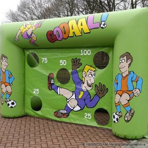 An dieser aufblasbaren Torwand können Ihre Gäste ihr fußballerisches Können unter Beweis stellen. Die verschiedenen Punktzahlen in der Plane ermöglichen es diese Torwand auch bei jeder Art von Olympiaden einzusetzen.