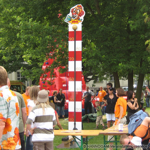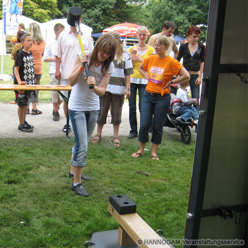 Dieses Spiel ist bei Jung und Alt gleichermaßen bekannt wie beliebt. Mittels Hammer stellt man seine Treffsicherheit unter Beweis und misst seine Kräfte anhand der Skala bis die Glocke ertönt. Bei dem Erreichen gewisser Punkte können unterschiedliche Gewinne ausgegeben werden. Seine Höhe beträgt etwa 4,50 m. Wir empfehlen optional dazu unseren Holzzaun. Diesen benutzen wir, wenn Sie diese Aktion durch uns betreuen lassen, um das Umfeld abzusichern.