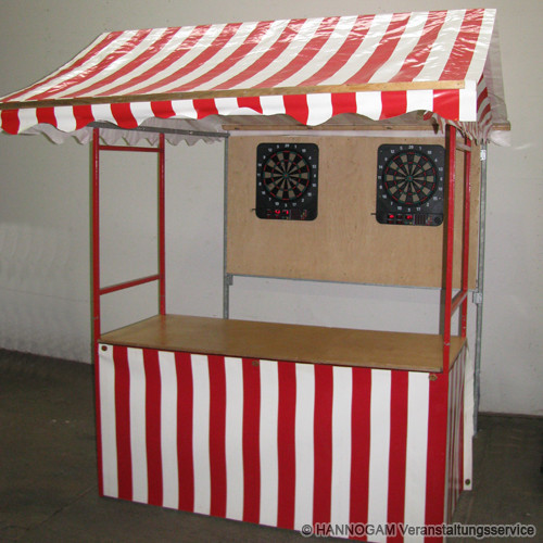 Das Softdart wird in einem Marktstand aufgebaut. Hierbei können an zwei Scheiben jeweils 8 Mitspieler gleichzeitig gegeneinander spielen.