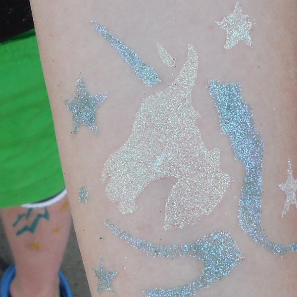 Diese Aktion ist eine nette Variante und Ergänzung zum Kinderschminken. Die Kinder können sich unter einer Vielzahl von Motiven Ihr Gemälde heraussuchen, welches dann von einer unserer Künstlerinnen verwirklicht wird. Die Glitzertattoos bestehen aus hautverträglichem Hautkleber und Streuglitzer. Sie verschwinden nach wenigen Tagen von selbst. Auf Wunsch kann diese Attraktion in einem wetterfesten Pavillon (3 x 3 m ) präsentiert werden.