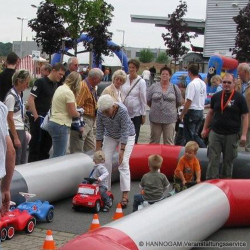Der Bobbycar Parcours ist überwiegend zum bespaßen Ihrer kleinen Gäste gedacht. Aber auch Erwachsene können kniend auf den Bobbycars rasant den Parcours umrunden. Wenn sie die 10 x 16m große Fahrbahn mieten bekommen sie zusätzlich 14 Bobby Cars in verschiedenen Ausführungen von Feuerwehr über Polizei bis hin zum pinken Rockstar Girl ist alles vertreten. Als Untergrund eignen sich besonders feste, ebene Flächen aus Beton, Asphalt oder Verbundsteinpflaster. Der Bobby Car Parcours ist die ideale Möglichkeit viele kleine Gäste gleichzeitig über einen langen Zeitraum zu bespaßen. Zusammen mit einer Hüpfburg werden sie keine enttäuschten Gesichter sehen. Der Hannogam Eventservice ist eine Vermietung von Bobby Car Parcours mit Sitz in Hannover und Übergabestellen in Bremen, Hamburg, Bielefeld, Göttingen und Magdeburg. Gerne können wir ihnen die Bobbycar Rennbahn für ihre Feier zum Beispiel in Schwerin, Hildesheim, Salzgitter, Stendal, Brandenburg oder Rinteln leihen. Der Hannogam Veranstaltungsservice ist ein bundesweiter Verleih von Eventmodulen zu ihrem Straßenfest, Firmenfeier, Party, Event oder Sportfest. Unsere Vermietung plant mit Ihnen gerne ihre Veranstaltung zum Beispiel in Wolfsburg, Helmstedt, Melle, Bad Rothenfelde, Syke, Kiel oder Cloppenburg.