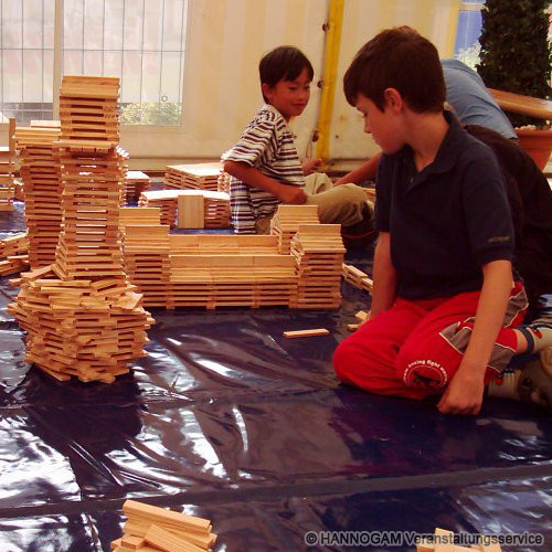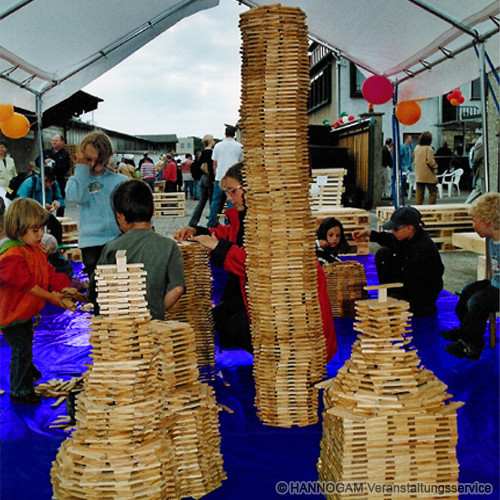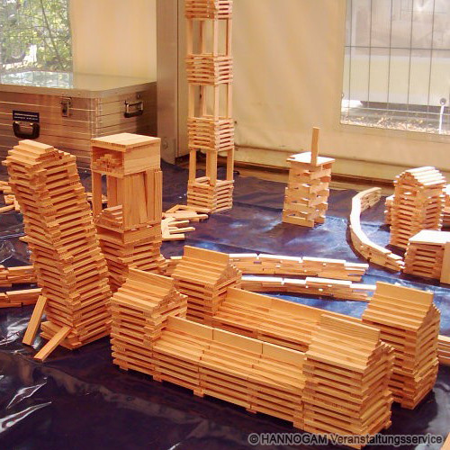 Tausende von gleichgroßen Holzplättchen regen die Kreativität all Ihrer Besucher an. Auf einem 5 x 4 m großen Untergrund entstehen die schönsten Fantasiegebilde, und so mancher Vater hat schon die Türme oder Figuren seiner Kinder vollendet. Wenn die Aktion von uns betreut wird, ist die Spielfläche 10 x 4 m groß und wir überdachen das gesamte Areal mit einem Pavillon.