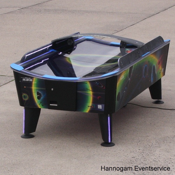 Der Air Hockey Storm professional ist ein Airhockey Tisch der neuesten Generation. Air Hockey wird mit zwei Spielern gespielt. Er hat ein Hochleistungsgebläse für einen schnellen Spielverlauf, eine gewölbte Spielfläche für ein interessanteres Spiel, LED Lichtleisten für die Beleuchtung des Spielfeldes und viele LEDs um den Airhockeytisch ins rechte Licht zu rücken. Der Airhockey Tisch ist dauerhaft auf Freispiel eingestellt. Ein Spiel ist beendet wenn der bessere Spieler als erstes neun Tore geschossen hat oder wenn die voreingestellte Spielzeit von fünf Minuten erreicht wird. Zur Sicherheit der Spieler wird mit speziellen Sicherheitsschlägern gespielt und in der Mitte des Tisches befindet sich eine senkrechte Scheibe um das abschießen des Gegners zu verhindern.