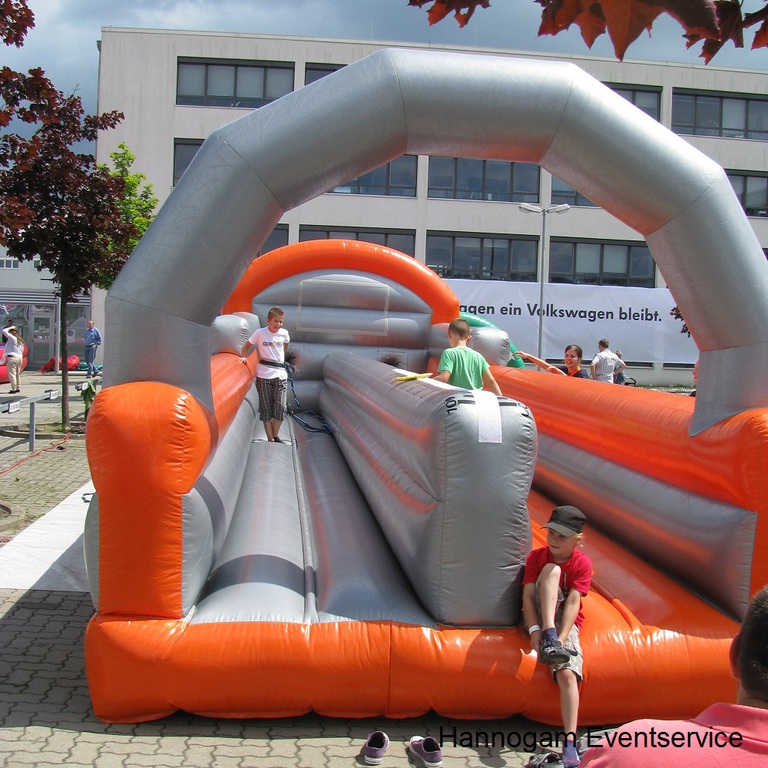 Das Bungeerun wird mit zwei Teilnehmern bespielt. Beide Personen werden mit Expanderseilen an der Rückwand des Bungee Run befestigt. Sie müssen dann mit viel Schwung versuchen soweit wie möglich auf dem Bungee-Run nach vorne zu laufen und am weitesten Punkt ein Klettkissen zu befesigen. Wer das Klettkissen weiter transportieren kann hat gewonnen. Sollten die Teilnehmer/innen unterschiedlich schwer sein kann die Zugkraft der Gummiseile individuell angepasst werden. Die Hüpfburg Bungeerun kann zusammen mit anderen Wettkampfmodulen als Parcours mit verschiedenen Stationen betrieben werden. Aber auch wenn sie die Bungee Laufbahn alleine mieten ergeben sich viele lustige Situationen die den Wettkampf zweitrangig werden lassen. Das Bungy Running ist ein Großspielgerät, welches sie bestens mit anderen Attraktionen wie Hüpfburg, Rutsche, Bullriding oder Schleuderball kombinieren können. Der Hannogam Eventservice ist eine Vermietung für Bungeerun in Hamburg, Bremen, Hannover, Magdeburg, Göttingen und Bielefeld. Gerne können sie bei uns Eventmodule, Fun Food und Veranstaltungstechnik zu ihrem Stadtfest, der Firmenfeier, Sportfest, Abi Streich oder Betriebsfeier leihen. Der Hannogam Veranstaltungsservice ist ein bundesweit tätiger Verleih von Partyzubehör. Gerne kommen wir auch zu ihnen nach Salzgitter, Holzminden, Brandenburg, Gardelegen, Dessau Roßlau, Ratzeburg, Buxtehude oder Wilhelmshaven. Die Vermietung kann aber auch nach Essen, Bramsche, Lage, Uslar, Nordhausen oder Wolfsburg erfolgen.