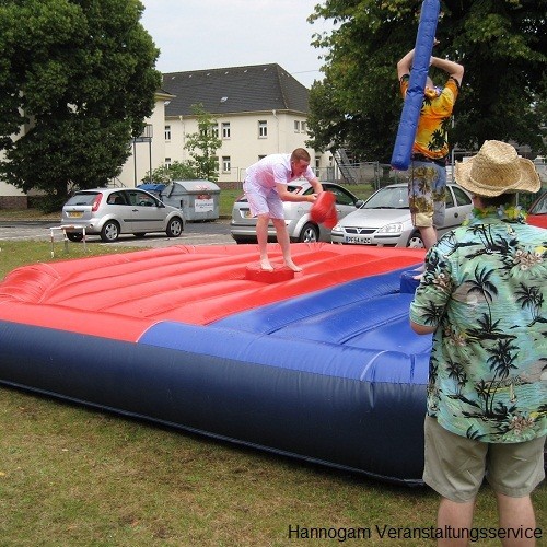 Die Hüpfburg Gladiator Game hat eine Größe von 6,00 x 7,00 m. Zwei Spieler treten gegeneinander an und müssen versuchen den Gegner von seinem Podest zu stoßen.