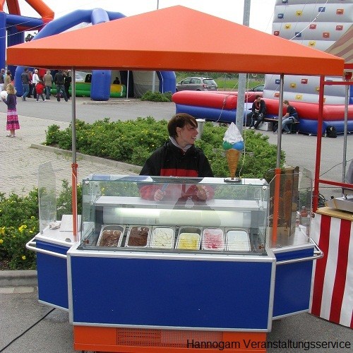 Mit diesem Eiswagen können Sie loses Eis in der Waffel oder im Becher an Ihre Gäste verteilen. Sie haben die Möglichkeit bis zu 6 Eissorten gleichzeitig auszustellen. Als Eis können Sie Eis von der Eisdiele in 36 cm langen Nirostabehältern bestellen oder abgepacktes Eis aus dem Supermarkt erhalten. Der Eiswagen hat ein zusätzliches Kühlfach um bis zu 6 Eispackungen zu bevorraten. Der Wagen hat eine Größe von 2,10 x 0,90 m. Die Höhe des Eiswagens beträgt 1,80 m wenn das Dach heruntergelassen ist.
