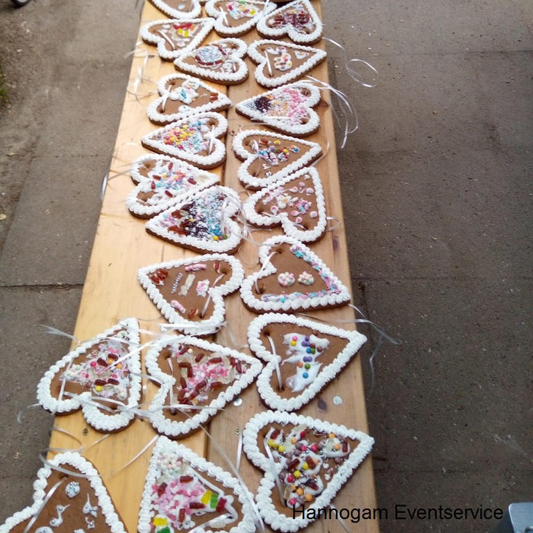 Wir bringen 100 oder 200 unbeschriftete Lebkuchenherzen, sowie alles an Zubehör mit.