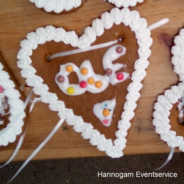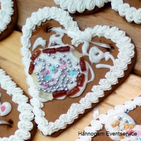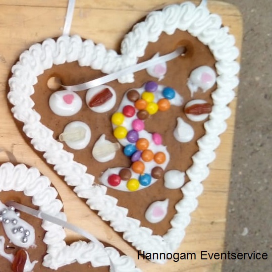 Wir gestalten zusammen mit Ihren kleinen Gästen Lebkuchenherzen in der Größe 18 x 19 cm, die diese danach an Ihre Verwandten verschenken können.