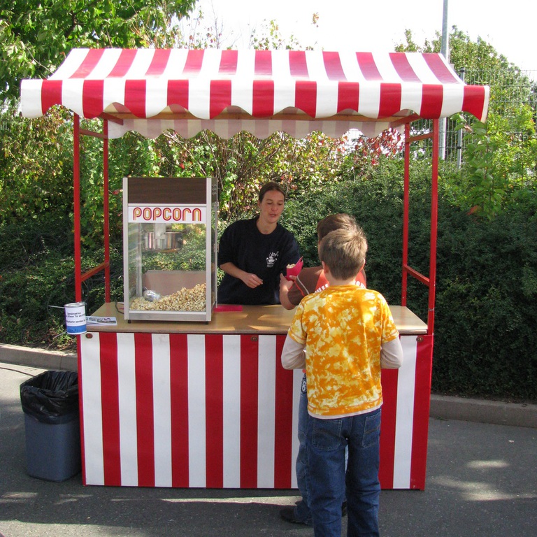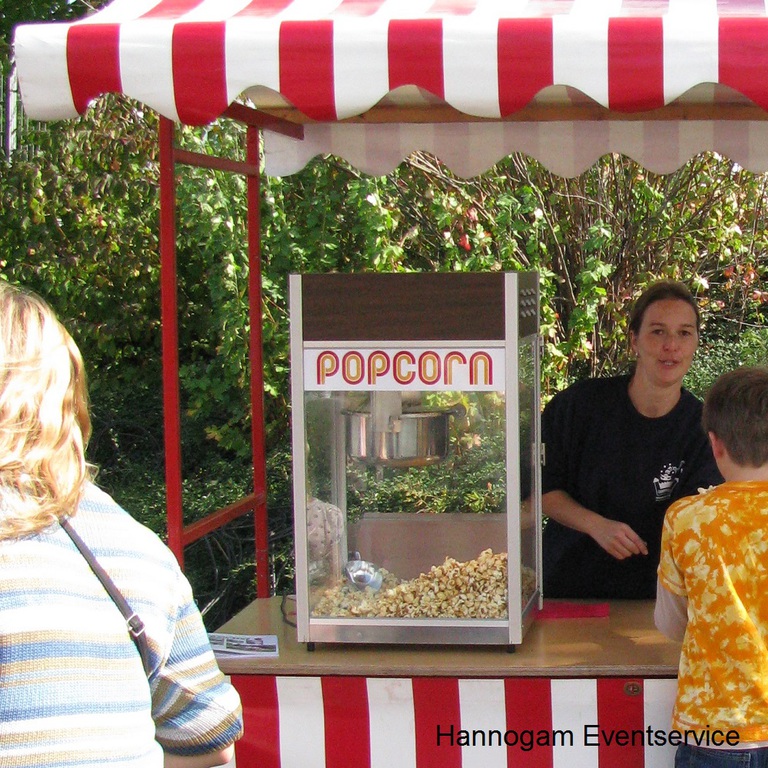 Wenn Sie die Popcornmaschine von uns betreuen lassen, dekorieren wir die Aktion mit einem Marktstand. Sie haben die Möglichkeit, nur die Maschine zu mieten (mit oder ohne Anlieferung), sich Material für Popcornportionen zu kaufen oder die Popcornmaschine mit Material, Betreuung und Marktstand zu mieten.