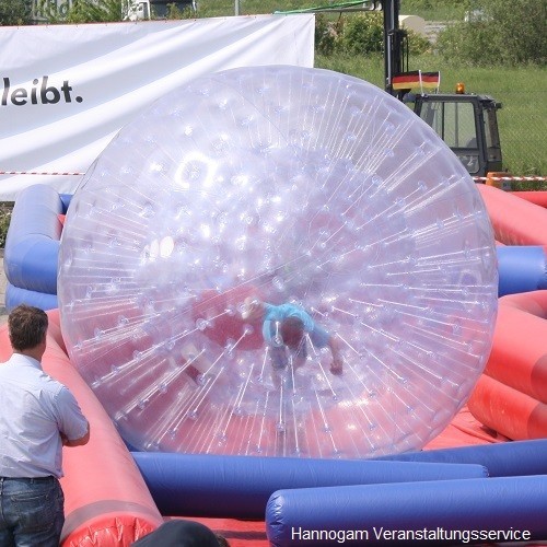 Der X-Cross Parcours hat eine Größe von 35,00 x 12,00 m mit einer Höhe von 3,00 m. Dieser Parcours eignet sich sowohl für Kinder, wie auch für Erwachsene als Wettkampfgerät oder einfach nur so zum Spaß. Zwei unserer Betreuer helfen den Teilnehmern in die Bälle und begleiten sie durch den Parcours.
