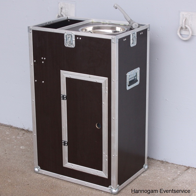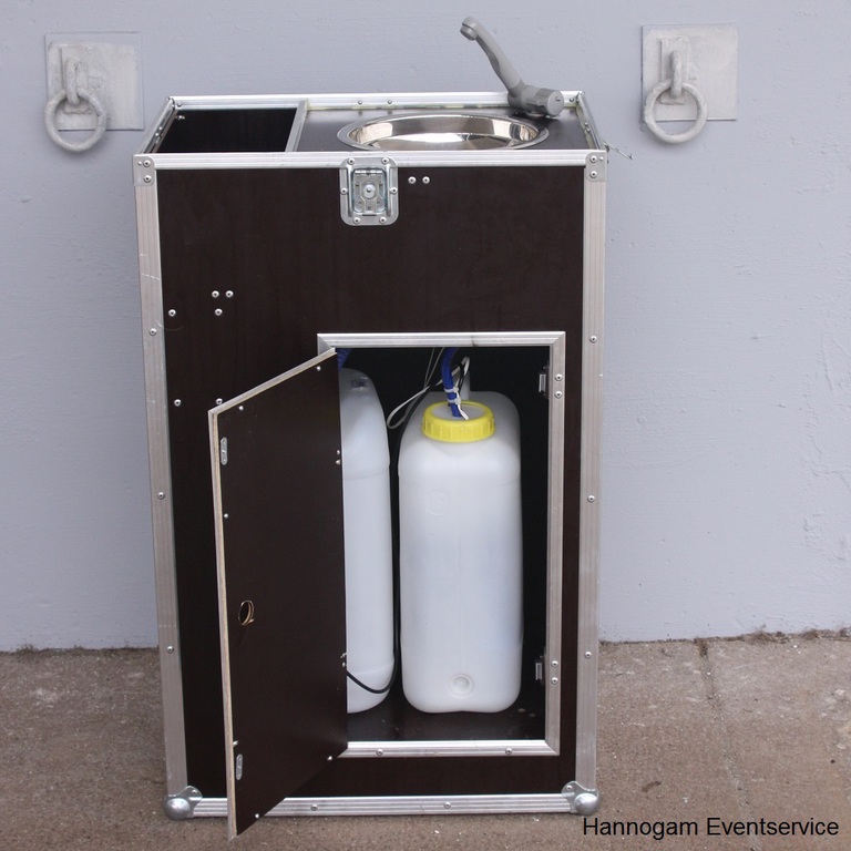 Wenn Sie frisch zubereitete Lebensmittel auf Ihrer Veranstaltung anbieten wollen, fordert der Gesetzgeber eine Waschgelegenheit für die Hände. Damit Sie diesen Hygienerichtlinien entsprechen können, bieten wir Ihnen eine Spüle an, die aus einem 20 l Wasserkanister mit Wasser gespeist wird. Durch den Stromanschluss besteht die Möglichkeit, das Wasser warm zu halten.