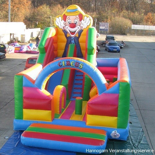 Größe ca. 4,50 x 8,50 m mit einer Höhe von 5,50 m. Dieses Spielvergnügen ist eine Kombination aus einer Rutsche mit einer Rutschenhöhe von ca. 2,20 m und einer Hüpfburg mit einer Sprungfläche von ca. 15 m². Auf der Hüpffläche befinden sich diverse Figuren, die zum Toben animieren. Dieses Multiplay Zirkus ist alleine schon durch seine Höhe ein weithin sichtbarer Anziehungspunkt.