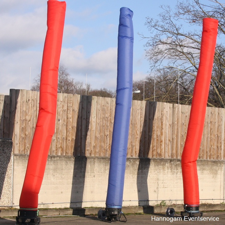 Die Air Tubes sind lange Stoffröhren, die durch einen Luftstrom in Position gehalten werden. Trotzdem bewegen sie sich im Wind und erzeugen deshalb eine hohe Aufmerksamkeit bei Ihren Gästen. Sie haben eine Höhe von 7,00 m. Platzbedarf ca. 7,00 x 7,00 m.