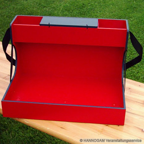 Dieser Bauchladen eignet sich hervorragend um kleine Leckereien oder Give-Aways unter seinen Gästen zu verteilen. Im oberen Bereich ist ein kleines Fach mit Deckel integriert, in dem Wechselgeld verstaut werden kann, wenn beispielsweise Lose verkauft werden sollen.