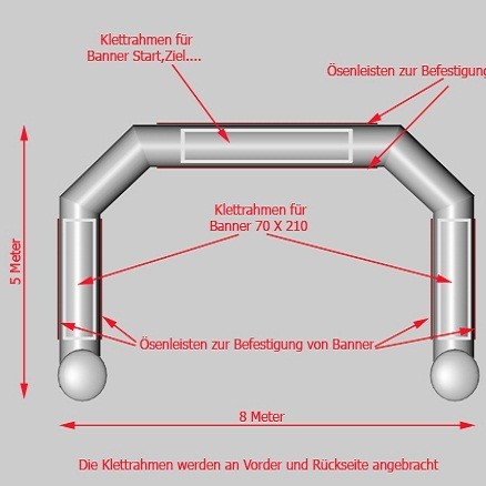 Der Torbogen kann für viele Gelegenheiten genutzt werden. Z.B. als Kennzeichnung eines Start oder Zielbereichs bei einem Wettkampf oder als Eyecatcher am Eingang zu Ihrem Gelände mit der Beschriftung Herzlich Willkommen. Zusätzlich zu fertigen Beschriftungen (Start / Ziel / Herzlich Willkommen / Danke für Ihren Besuch) haben Sie die Möglichkeit Ihre eigenen Werbebanner aufzuhängen oder anfertigen zu lassen.